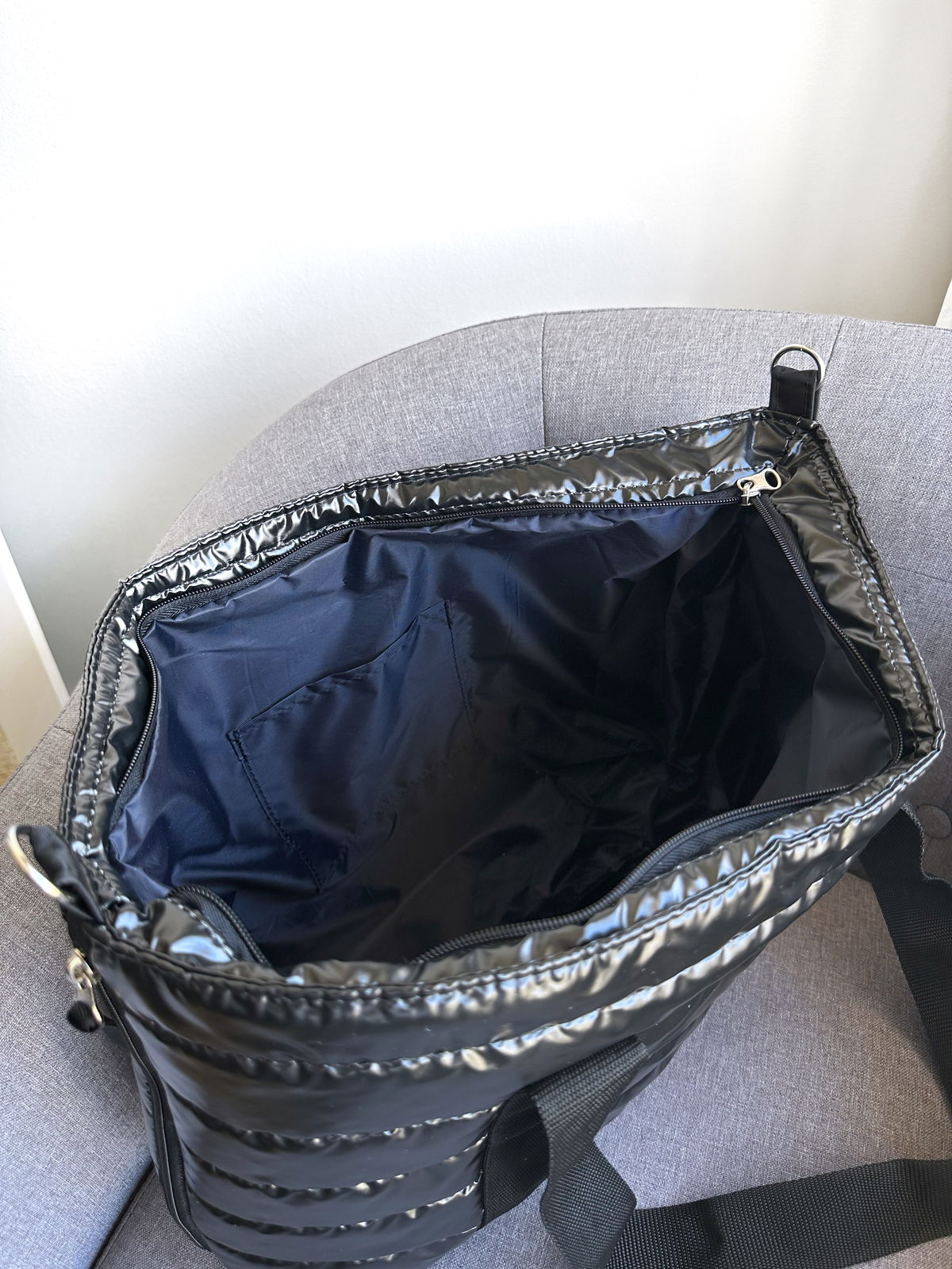 Tote bag puffer metalizada con cierre. Interior silver, bolsillo interno. Cierre externo con cierre de costado