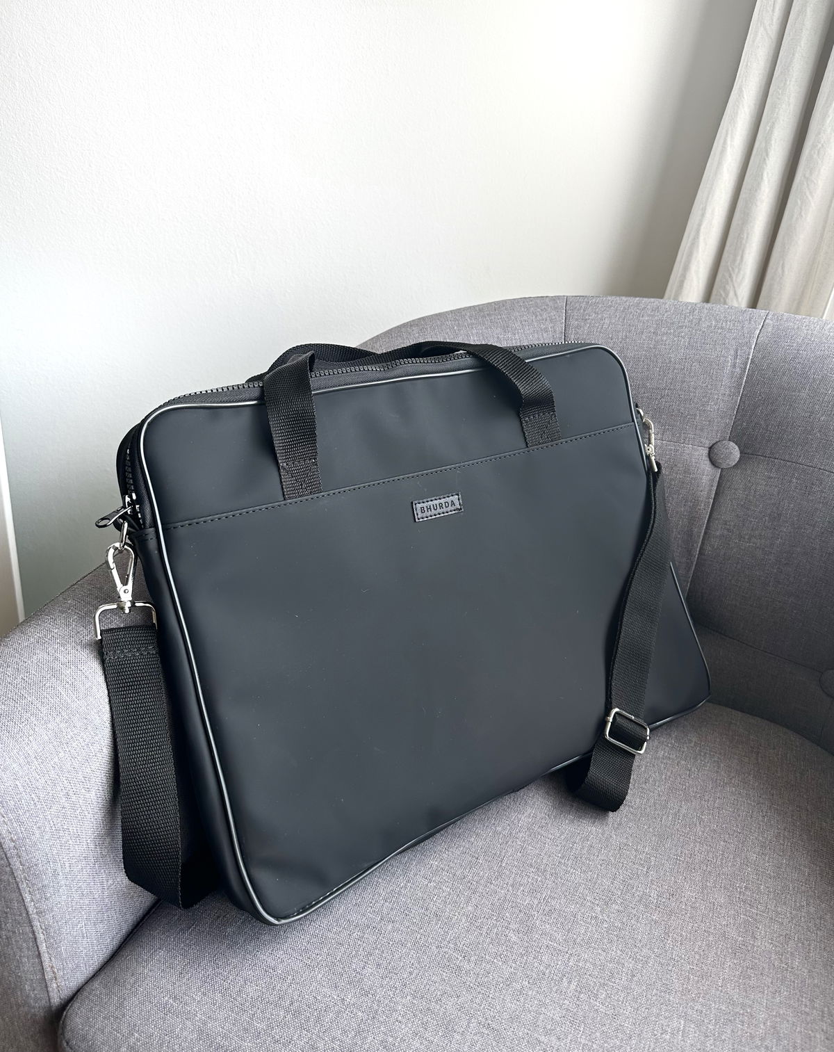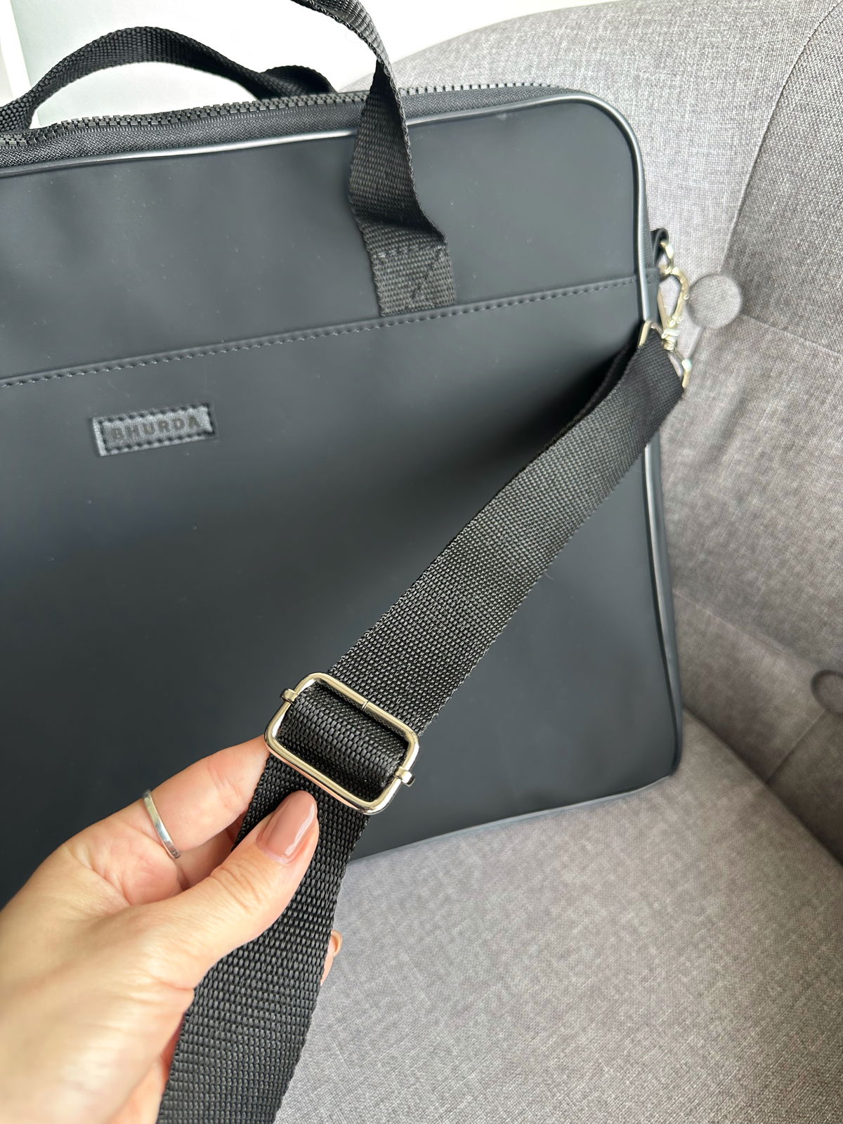 Portanotebook unisex engomado negro. Correa desmontable y regulable para que uses tu portacompu a la altura que te quede más cómoda!