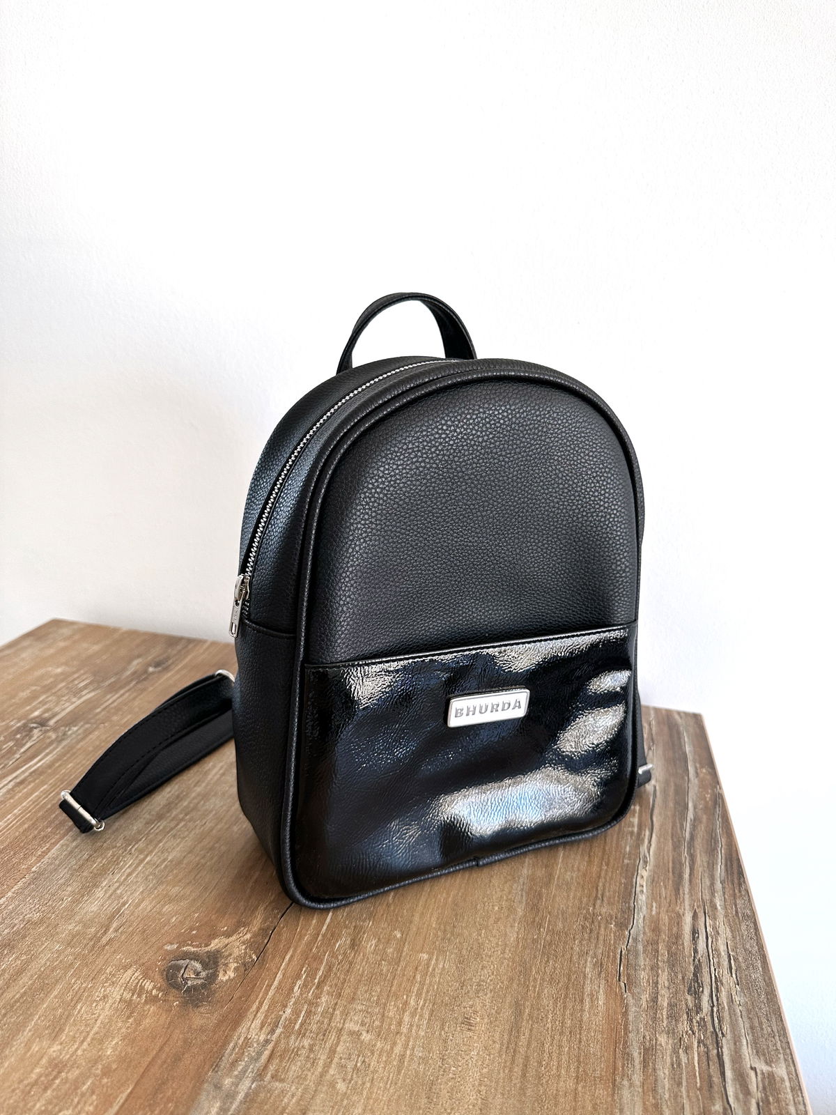 Mochila con bolsillo frontal de charol, correas regulables, bolsillo