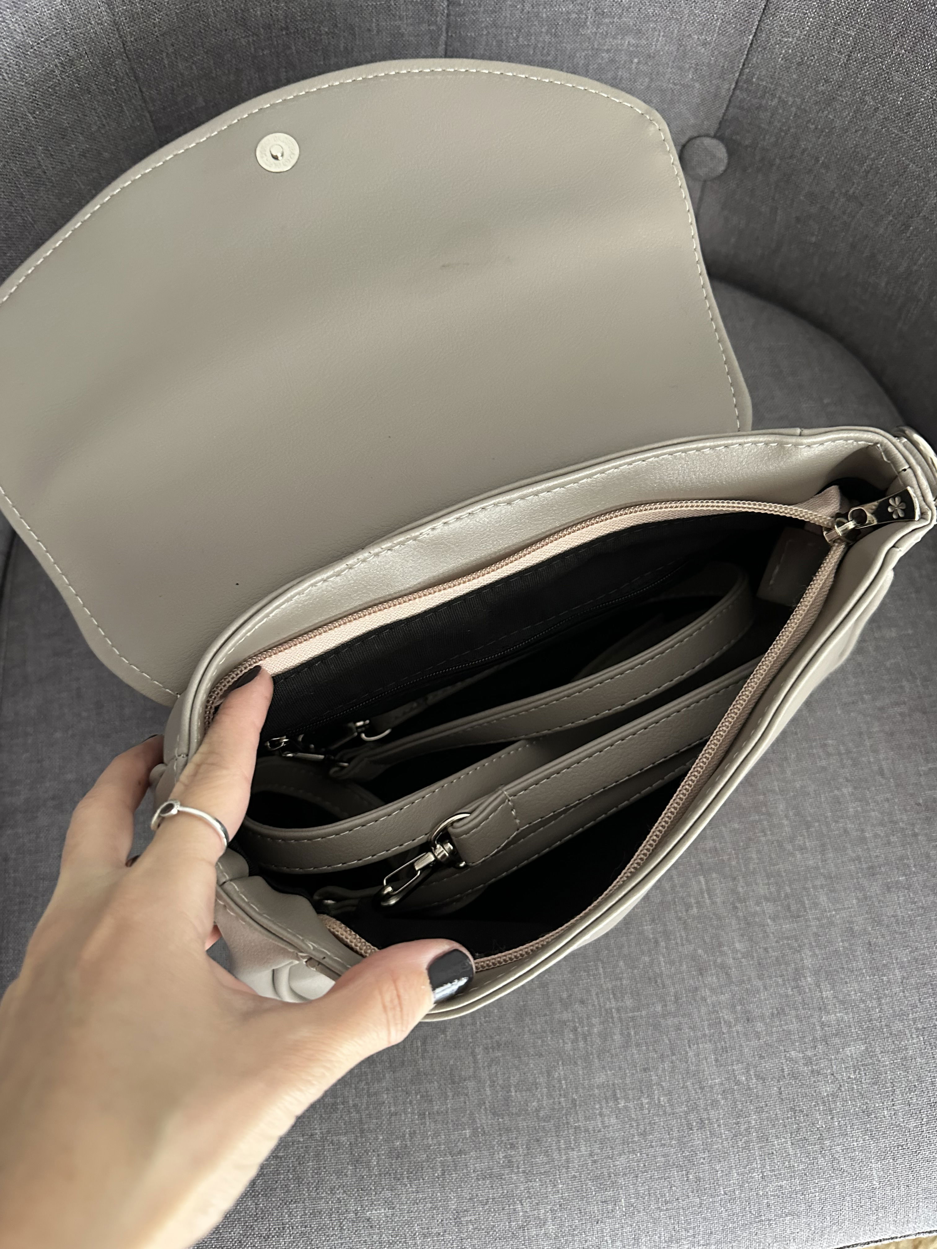 Tiene dos correas: una corta para llevarla al hombro o en el brazo, y otra larga regulable con hebilla, por si preferís usarla cruzada.