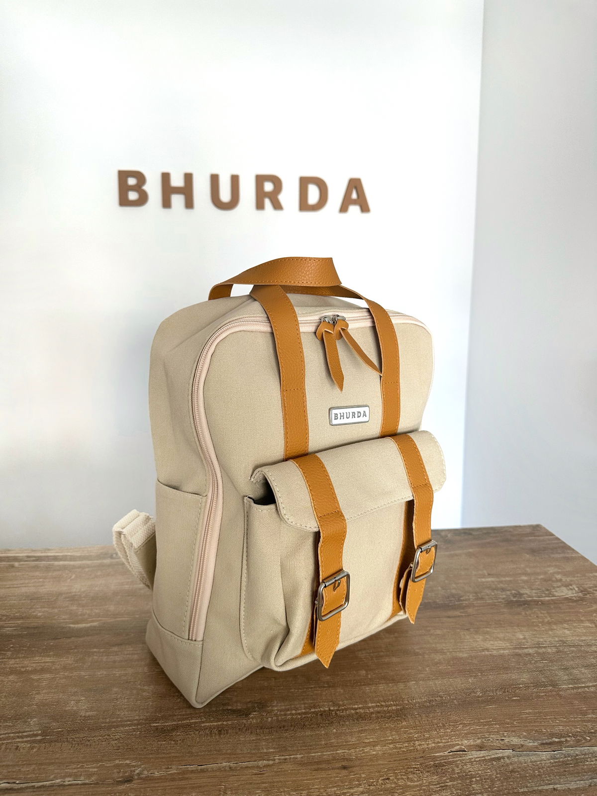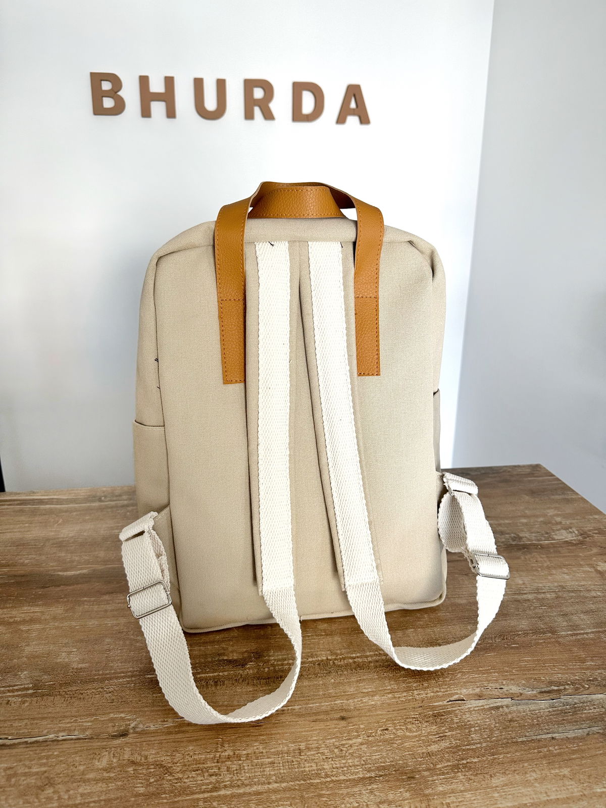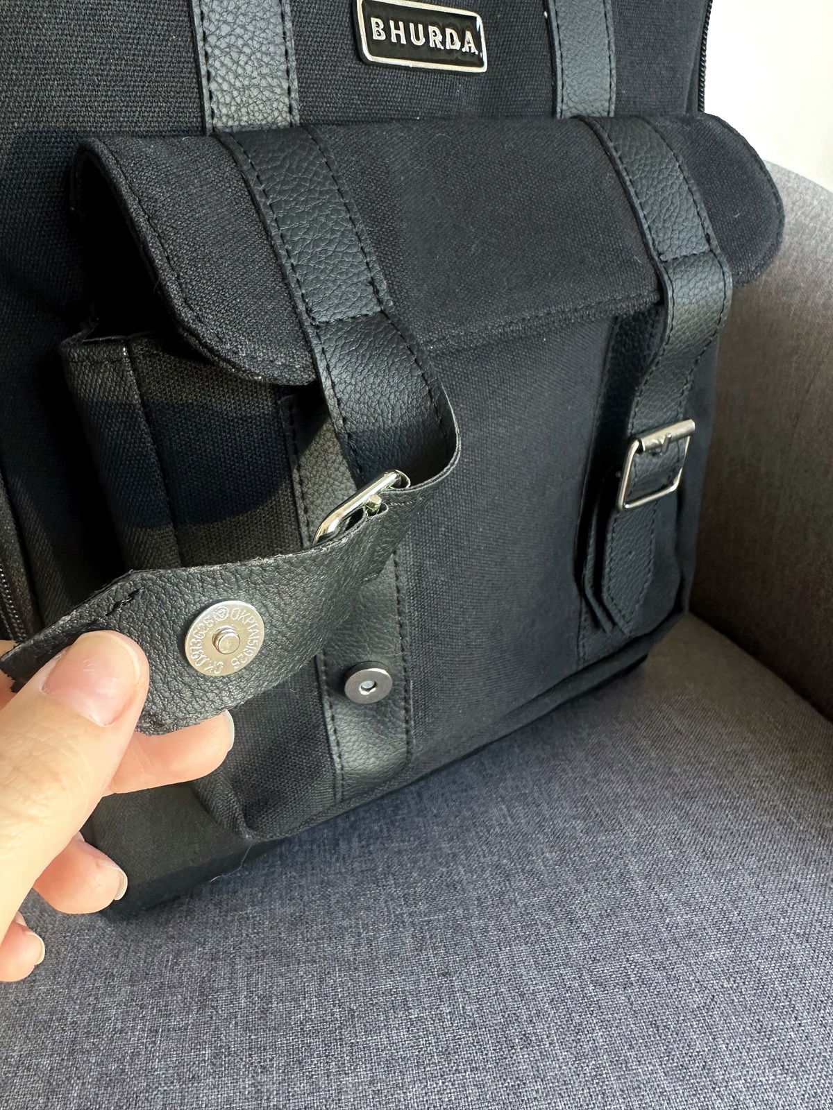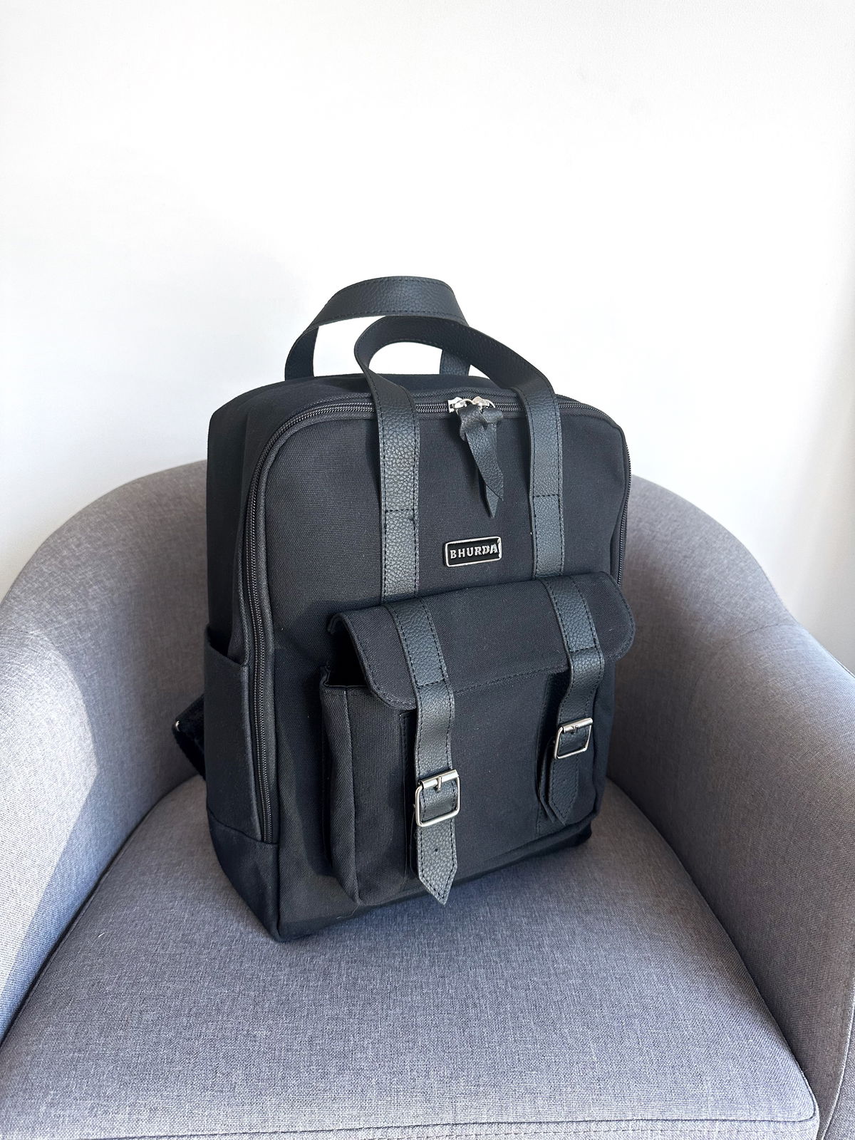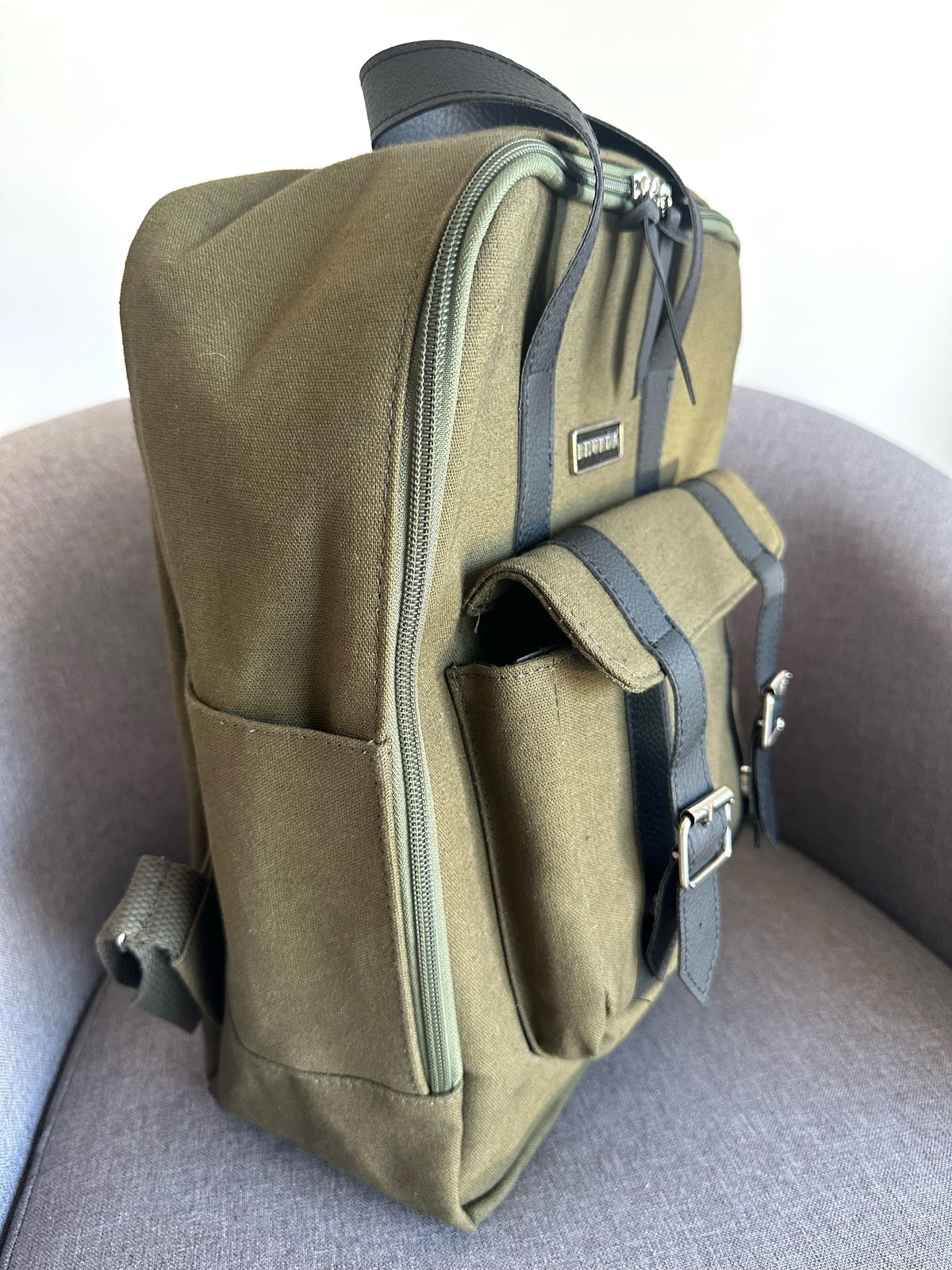 Cuenta con dos bolsillos laterales, un bolsillo frontal externo con acceso con broche imán y un bolsillo interno para guardar la computadora de 23/24 cm aproximadamente.