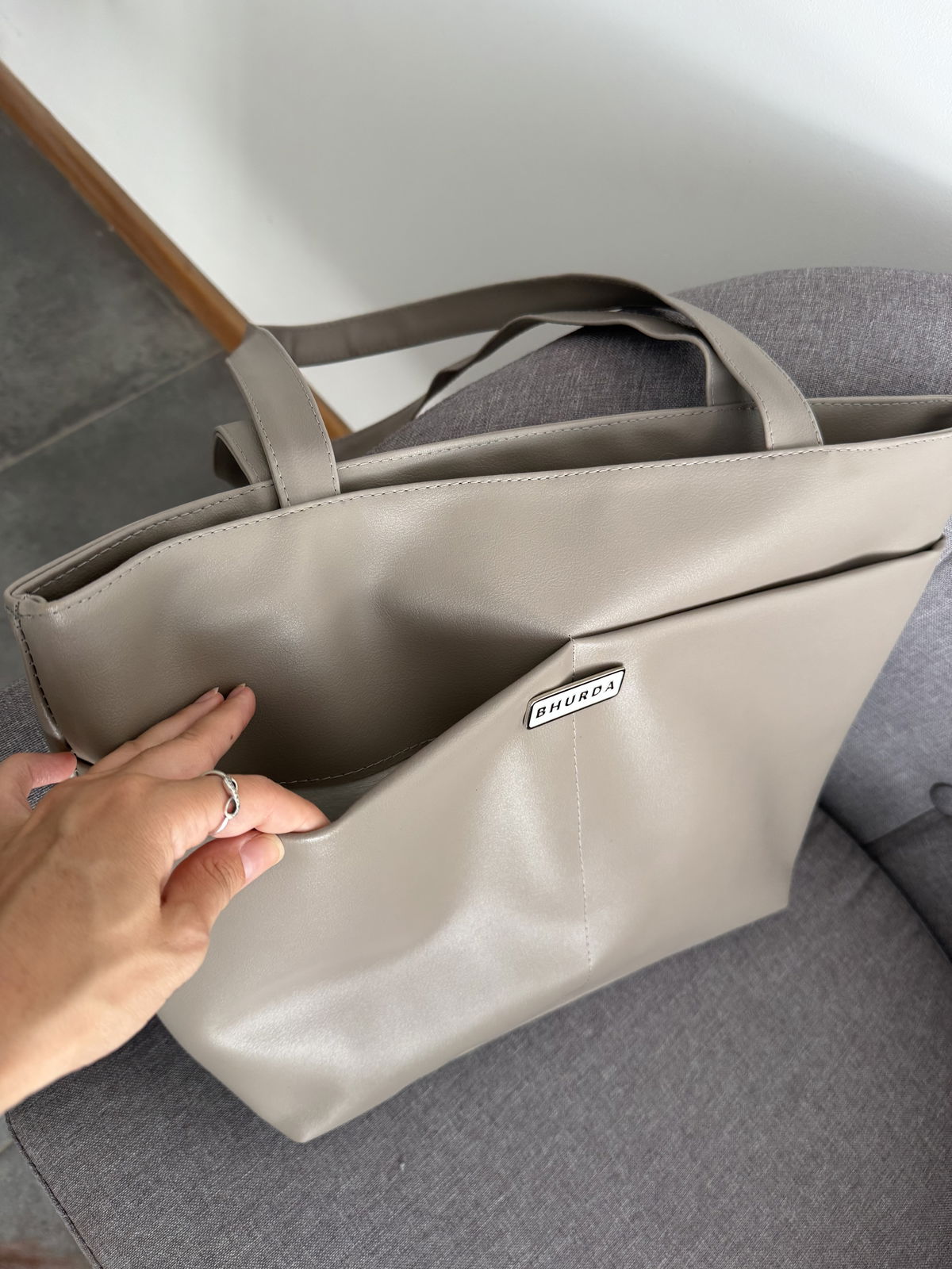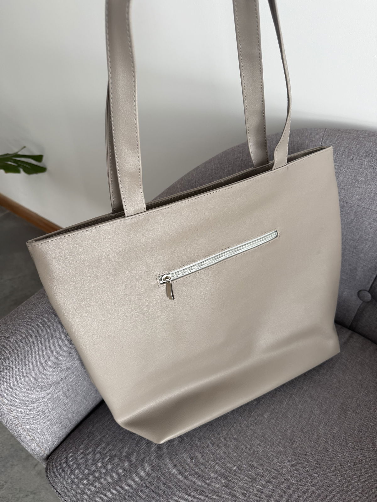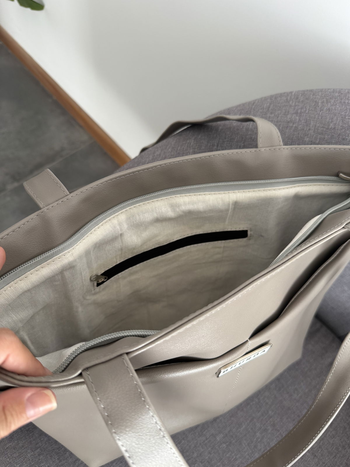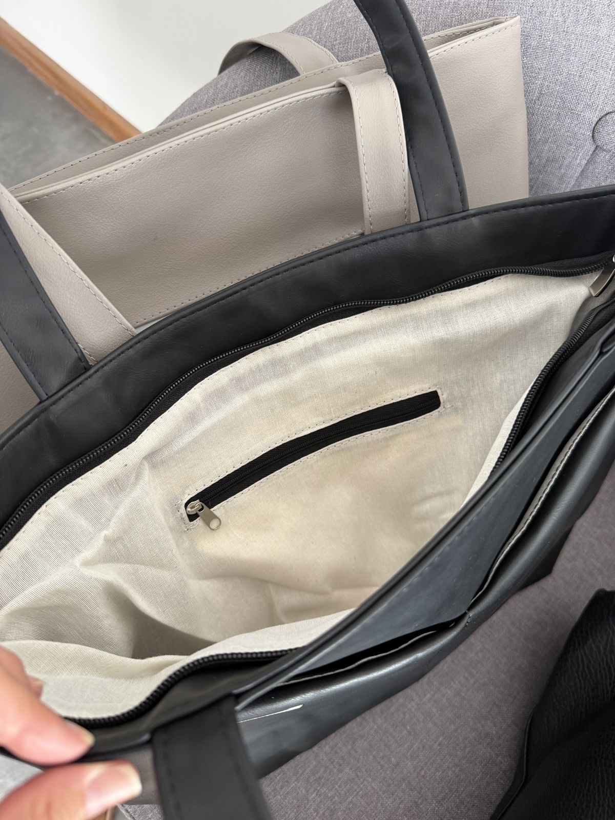 Tote bag con dos bolsillos frontales, un bolsillo con cierre en la parte trasera. Cierre de acceso y bolsillo con cierre interno